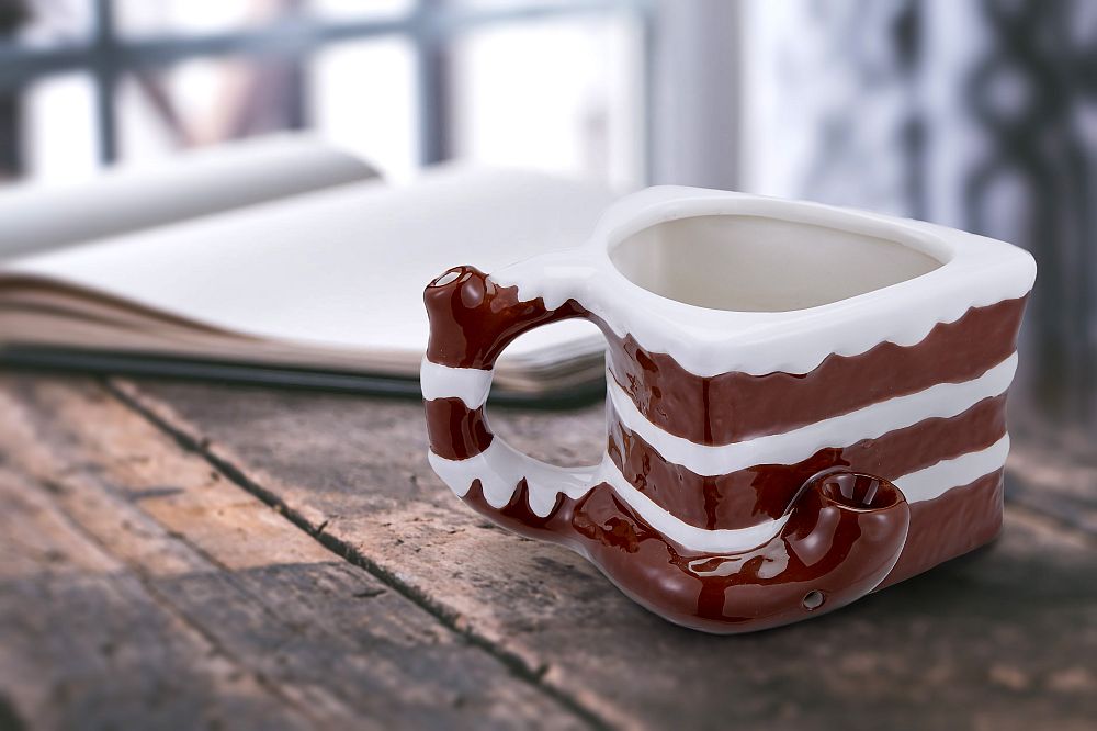 Indulge in the perfect combination of a morning coffee, a sweet chocolate cake, and a relaxing smoke with this unique novelty pipe mug. Crafted from ceramic, this mug holds approximately 16oz of your favorite beverage, while featuring a realistic layered chocolate cake design that adds a touch of whimsy to your routine.