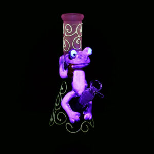 Experience smoking like royalty with the Frog King Beaker Water Pipe. Standing at 9.75 inches tall, this pipe features a classic beaker style body with a 3 pinch ice catcher, ensuring smoother and cooler hits. The standout feature is the intricately designed Frog King 3D graphic, which not only adds a unique touch but also glows in the dark for an added element of fun.